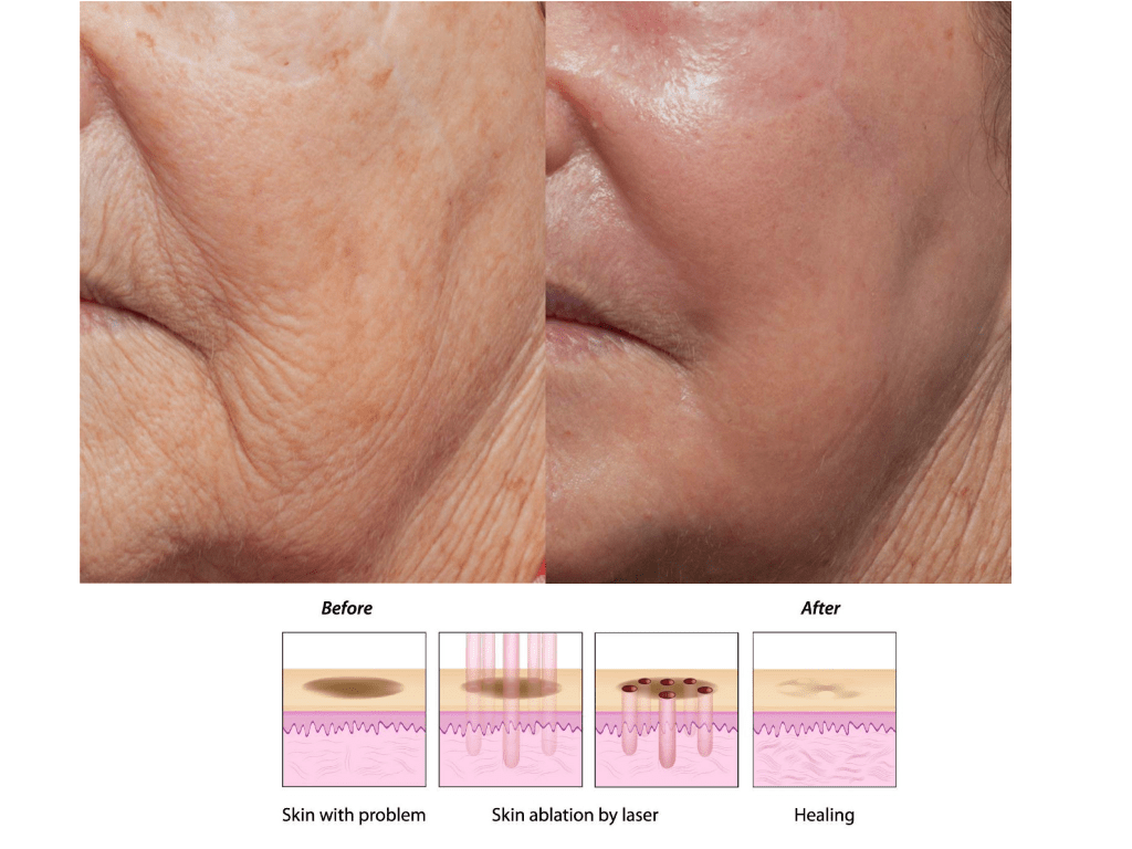 Ein fraktionierter CO2 Laser trägt das Gewebe in kurzen Impulsen durch hunderte von mikroskopisch kleinen Hitzesäulen pixelartig ab, ohne dass dabei die umliegende Hautoberfläche angegriffen wird. Nur die betroffene Hautpartie wird von dem CO2 Laser tangiert. Dabei lösen die Energieimpulse des Lasers eine Neubildung von Kollagen aus.