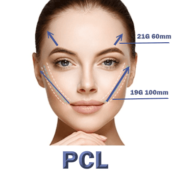 PCL-Fäden oder Fäden aus Kombinationsmaterialien einschließlich PCL sind in den letzten Jahren immer beliebter geworden. Sie bleiben mehr als 2 Jahre im Körper und werden auch in unserer Haut in natürlich vorkommende Stoffe abgebaut. Aufgrund der Länge der Kollagenstimulation sind sie leistungsfähigere Fäden als PDO- oder PLLA-Fäden. Am besten zur Straffung des Kiefers, zur Nasenstraffung und zum Ersatz von Mittelgesichtsgewebe geeignet. Die langsamere Abbaurate der PCL-Fäden macht sie ideal, um ein länger anhaltendes Ergebnis zu erzielen. Es ist auch bekannt, dass die PCL im Vergleich zur PDO oder PLLA die Kollagenproduktion sehr stark stimuliert. Sobald sich das Material aufgelöst hat, zerfällt es in nicht-toxische Substanzen, und selbst nachdem sich der Faden aufgelöst hat, kann der erzielte Effekt der Kollagenproduktion bis zu einem Jahr anhalten.
